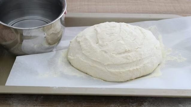 Cover with cling film and let rise for approximately 3 hours, until doubled in volume. You can place the bowl in a warm, humid place (or in the oven with the light on).