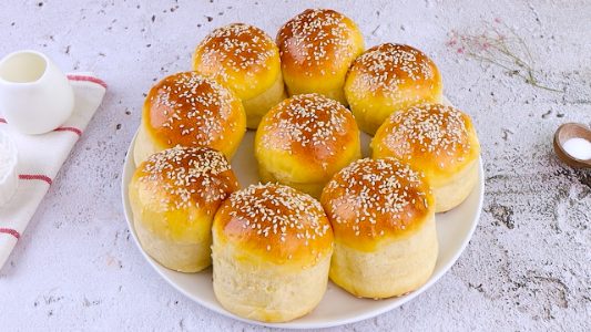 Yes, sesame seeds are completely optional and decorative. You can leave the buns plain or top them with poppy seeds, onion flakes, or even everything-bagel seasoning. The dough itself remains unchanged and just as fluffy.