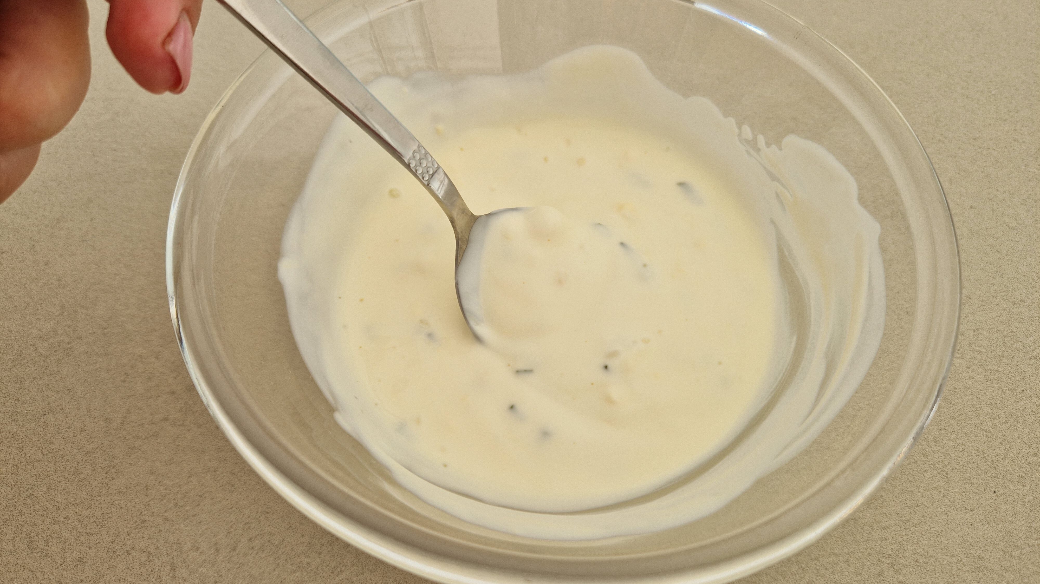 In the meantime, prepare the sauce: pour the yogurt into a bowl, add the mayonnaise, a little chopped chives and the garlic crushed with the garlic press.