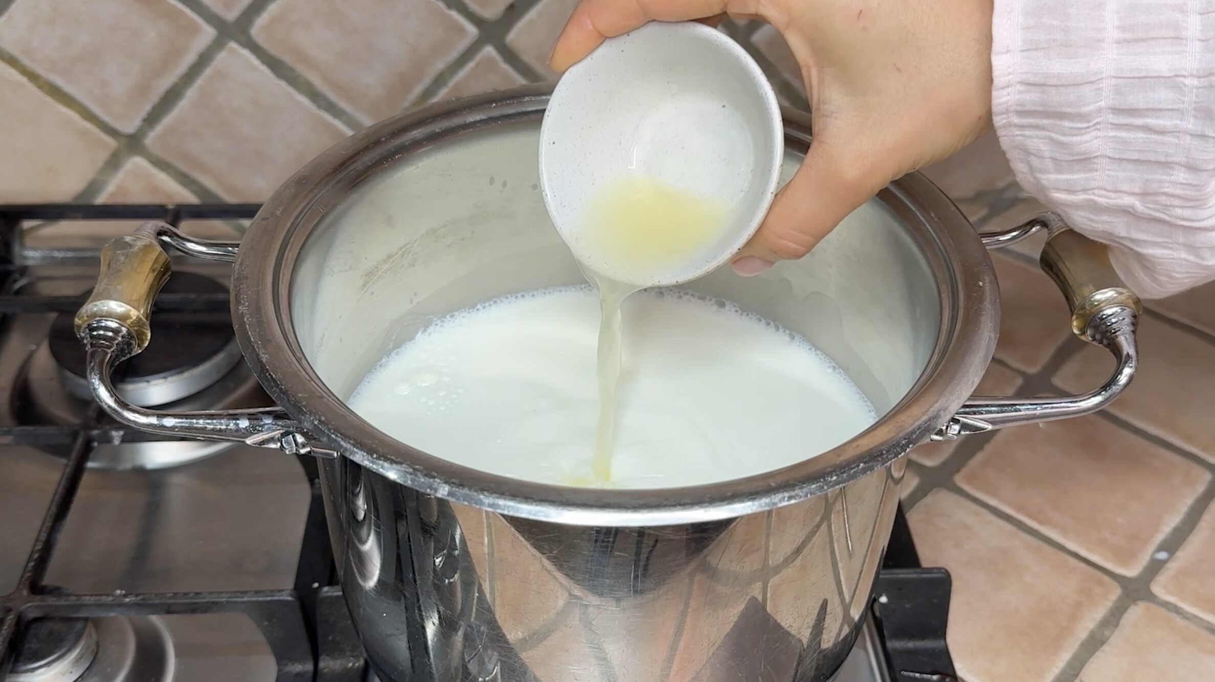 Pour the milk into a large pot and place it over low heat. As it warms, stir gently every now and then to prevent sticking. Soon, the milk will reach a delicate temperature—around 85–90°C (185–194°F)—or you’ll notice a fine foam forming along the edges. This is the perfect moment to add the lemon juice, gently stirring with a wooden spoon, and sprinkle in a pinch of salt.