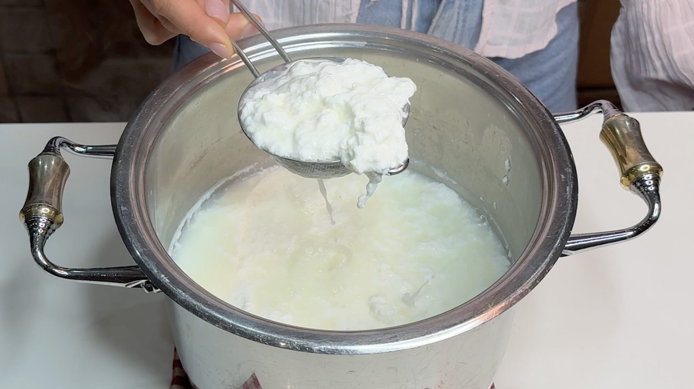 Cover the pot and let it rest for about 10 minutes. You’ll see the curds begin to separate from the whey, forming soft, fluffy clusters. Line a strainer with a clean cheesecloth and pour the curds over it, letting them drain until the ricotta reaches your desired consistency—creamy or firmer depending on your preference.