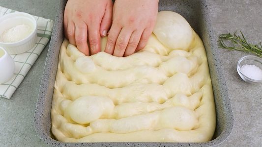 Oil a 25x35cm pan and transfer the dough into it. Fold it slightly, then begin pressing it out with your fingertips. Brush the surface with olive oil, cover, and let it rise for another 40 minutes.