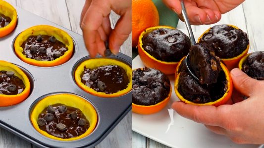 To make the orange peel mini cakes, you start by making a batter with flour with cocoa powder, baking soda and powder, salt, sugar, sour cream, eggs, milk, vanilla, vegetable oil, and chocolate chips. Then, the batter gets divided between hollowed oranges before being baked in a muffin pan in the oven. The resulting cakes will be so soft and fluffy, and full of chocolate flavor.