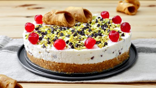 Finish with pistachio grains, extra chocolate chips, candied cherries, and cannoli pieces, then slice and serve.