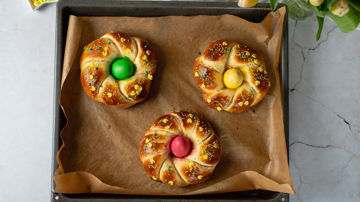Put it on a baking tray lined with parchment paper, and repeat with the remaining dough. Cover the dough with a damp towel and leave it in a warm place to double in size. If you haven't dyed your eggs, now is a good time to do it.