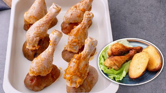 Chicken drumsticks on potatoes are just how they sound. Spiced chicken drumsticks are baked on top of potato halves and baked in the oven, allowing the potatoes to absorb all of the flavors from the chicken. This method of cooking chicken and potatoes not only looks elegant, but is also easy when you want to get something ready for dinner quickly.