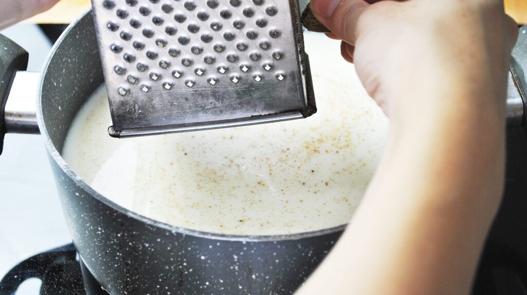 Dilute with the milk, add salt and pepper and cook until thickened. Finally, perfume with a pinch of nutmeg 7.