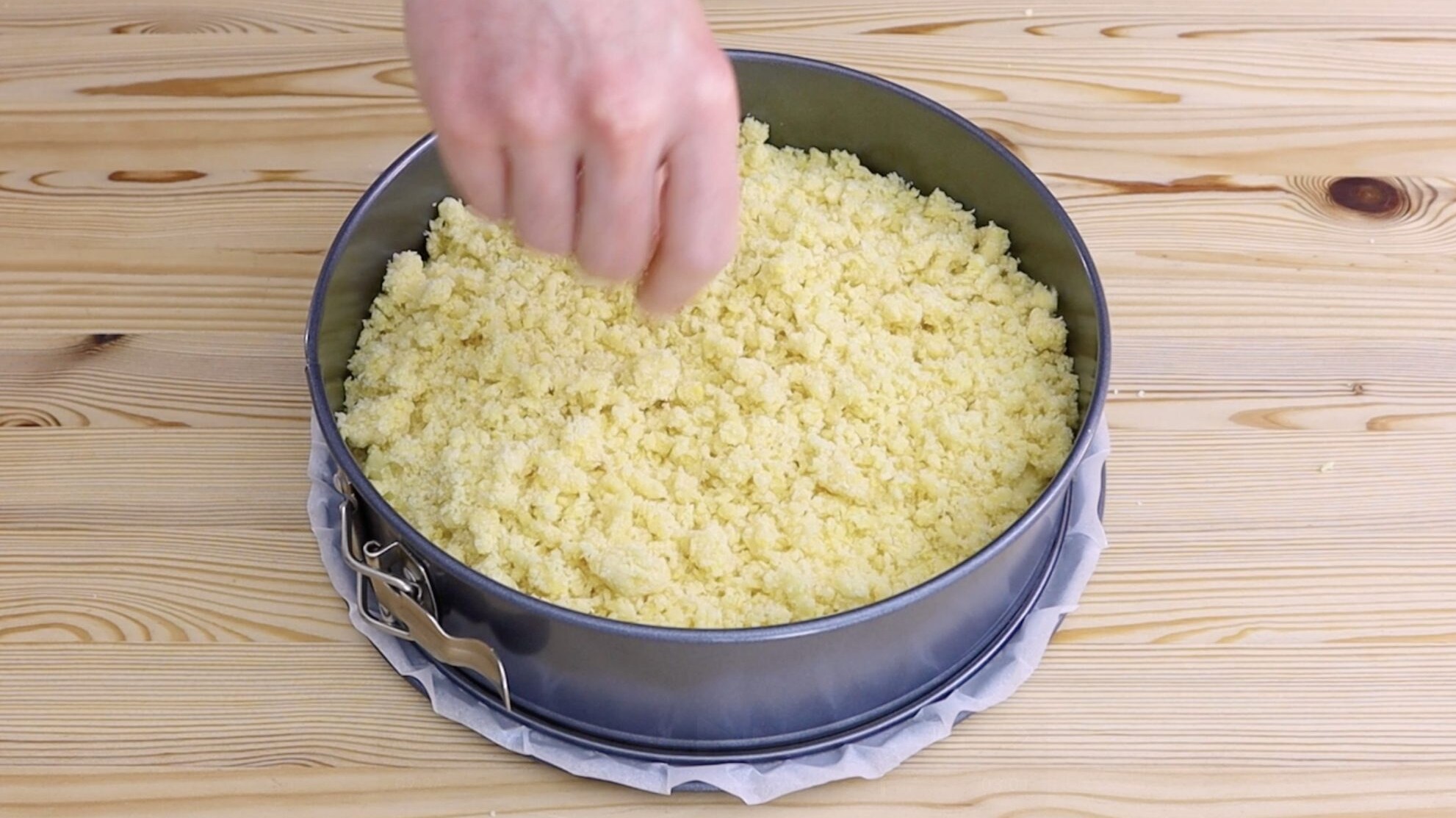 Press half of the crumbly dough onto the bottom of a 24cm cake pan lined with parchment paper.