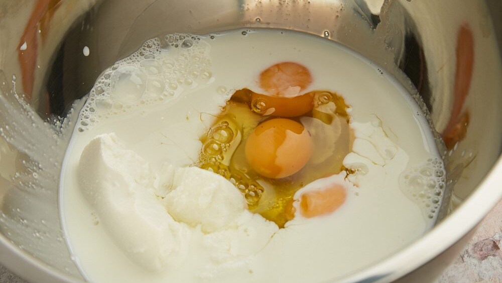 Get another large mixing bowl, and whisk together milk, ricotta, eggs, and vanilla until well blended.