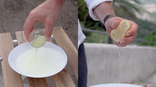 Inside of a soup plate mix water, the limoncello liquer and the squeeze of a whole lemon.