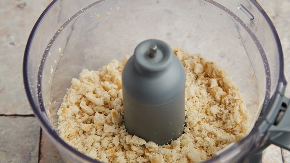 Remove the crust from the bread slices and cut into chunks (stale bread is better than fresh for these meatballs). Add the bread chunks into a food processor and pulse to create breadcrumbs.