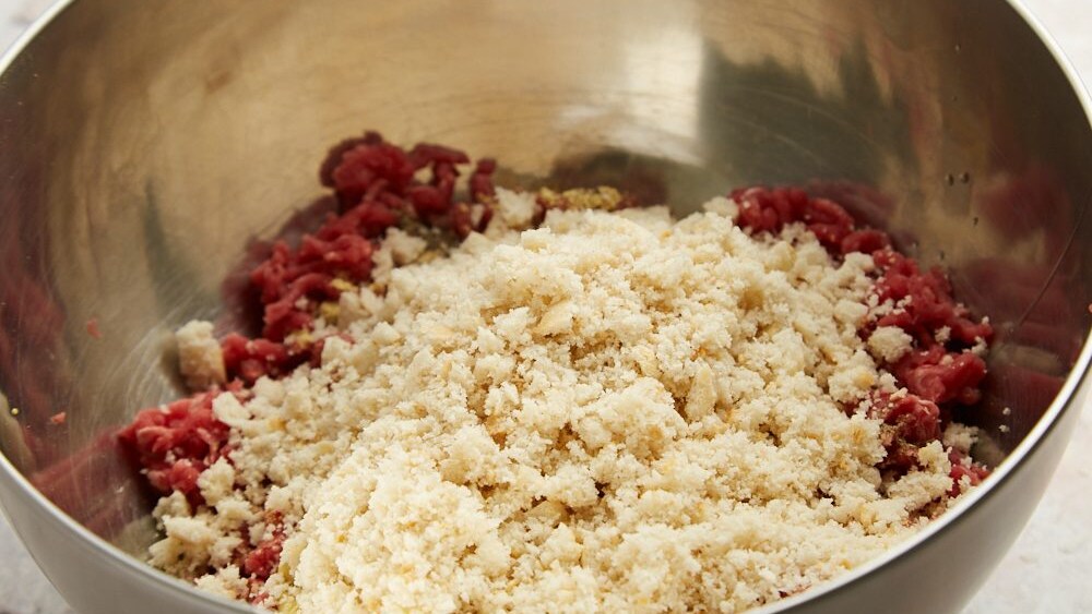 Put the breadcrumbs, ground beef, egg, olive oil, mustard, and the fenugreek in a large bowl.