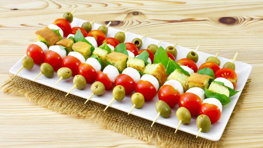 Now it’s time for the fun part! Take your skewers and alternate the ingredients in this order: one green olive, half a cherry tomato, one mozzarella pearl, one basil leaf, one bread cube, another half cherry tomato, and finish with another olive.