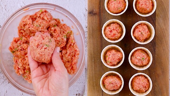 Roll the meat into balls and place each one in a muffin cup that’s been sprinkled with breadcrumbs.