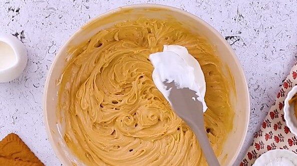 Remove the base from the fridge and pour the lotus cream on top. Use a spatula to level the mixture and to make it smooth. Refrigerate for at least 4 hours.