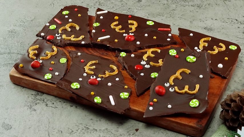 Reindeer chocolate bark is dark chocolate that is spread thinly, garnished with candies, pretzels, and sprinkles, and allowed to set before being broken into pieces for serving. Pretzels, round red candies, and candy eyes are arranged in such a way that they look like reindeer, which is perfect for the festive season.