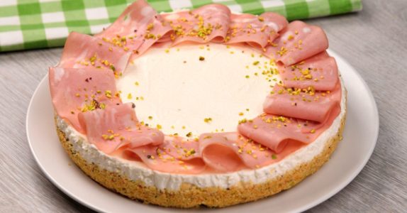 To make the savory cheesecake, you first blend ground crackers with ground pistachios and butter, and then it gets pressed into a round cake pan. Then, for the filling, you mix ricotta with cream cheese and milk before pouring it on top of the crust, and setting it in the fridge so it can set up. After that, the cake gets garnished with beautiful green pistachios and mortadella before being served.
