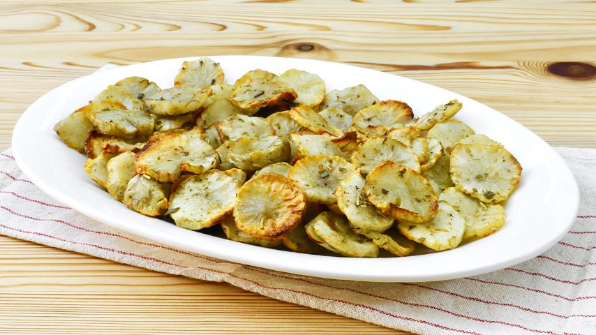 Arrange the slices in a single layer on a parchment-lined baking tray. Bake at 350°F (180°C) for 30 minutes, or until golden and crisp.