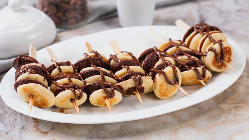 Looking for a quick and easy bite-sized recipe that your kids will love? These Pancake Skewers should definitely be on your list. It’s a kids’ favorite! The pancakes are soft and pillowy, with both vanilla and chocolate flavors. To make it, you simply make one pancake batter and divide it into two to create a separate chocolate batter. Pipe mini pancakes into a pan, add them to a skewer, and drizzle with hazelnut cream. As easy as that. You can even try some delicious healthy variations. This will become your new favorite breakfast recipe!
