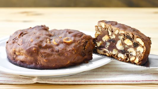 To make the panpepato, dark chocolate is melted with a hot honey syrup before being mixed with nuts, flour, spices, and soaked raisins. Then, the mixture gets shaped into a round loaf before being baked in the oven. Cut into slices, this dessert is crunchy with the nuts while also having a delicious fudginess from the chocolate and honey syrup.