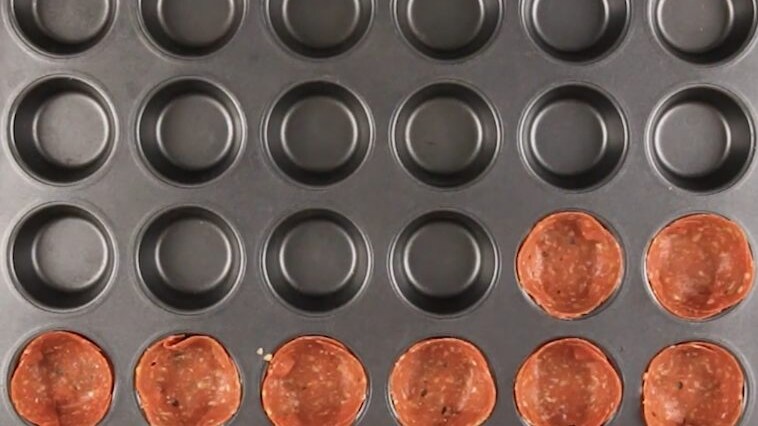 Prepare the salami or pepperoni first. This will form the base of the cups. Make 4 cuts into each pepperoni and place into the muffin case forming a cup. Bake for 6 minutes at 200°C/400°F. Remove from the oven and allow to cool for a minute.