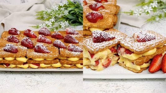 Biscuits Strawberry Cake is a no-bake layered dessert consisting of soaked cookies, a creamy vanilla custard, and fresh strawberries. The dessert is assembled in layers, creating a beautiful presentation that looks as good as it tastes. It’s a beloved dessert in many cultures, offering a combination of textures that make each bite truly memorable.