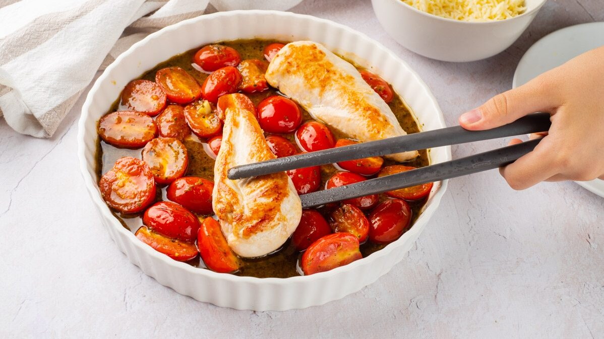 Garnish the chicken with mozzarella.