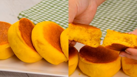 To make the pumpkin buns, you first make a dough with pumpkin puree, egg, salt, sugar, yeast, and flour. Then, after it has doubled in size, it gets divided into buns before being allowed to rise again. Finally, they are cooked in a pan on the stove so that they become golden on both sides.