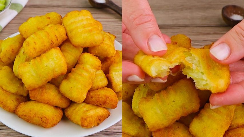 These potato fritters are fried morsels that consist of a seasoned potato mixture. The potatoes are boiled and mashed, and mixed with salt, pepper, cornstarch, and rice flour to give it a dough-like consistency. Then, the mixture gets shaped into squares before being fried in hot oil.