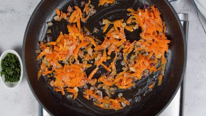 Heat a bit of olive oil in a large pan over medium heat. Add chopped onions and carrots, and sauté for 5 minutes.
