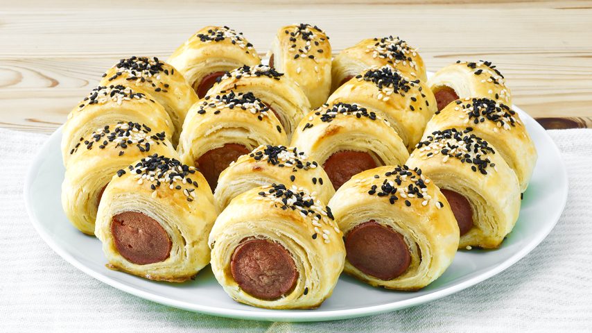 Puff Pastry Pigs in a Blanket are a quick and delicious appetizer, simple and flavorful snacks perfect for a brunch or a birthday buffet along with other delicious finger foods: they're a real hit with kids. They're made with just a few simple ingredients: puff pastry, large hot dog sausages, mustard, egg for brushing, and black and white sesame seeds for the top. Bake in about 20 minutes, and these delicious savory snacks are ready to enjoy.