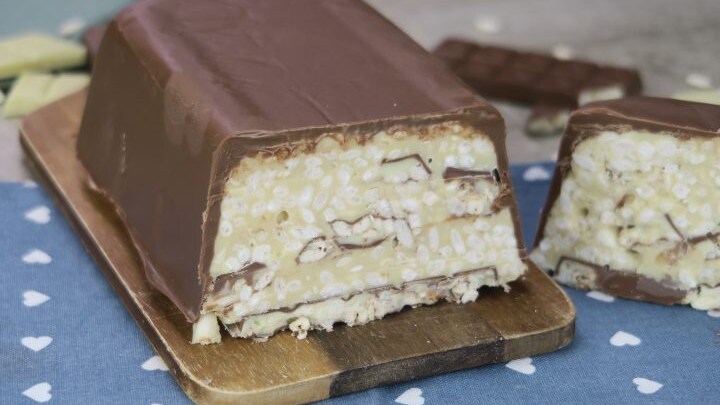 Ingredients: 300g milk chocolate; 500g white chocolate; 200g white hazelnut spread; 70g puffed rice; candy bars.