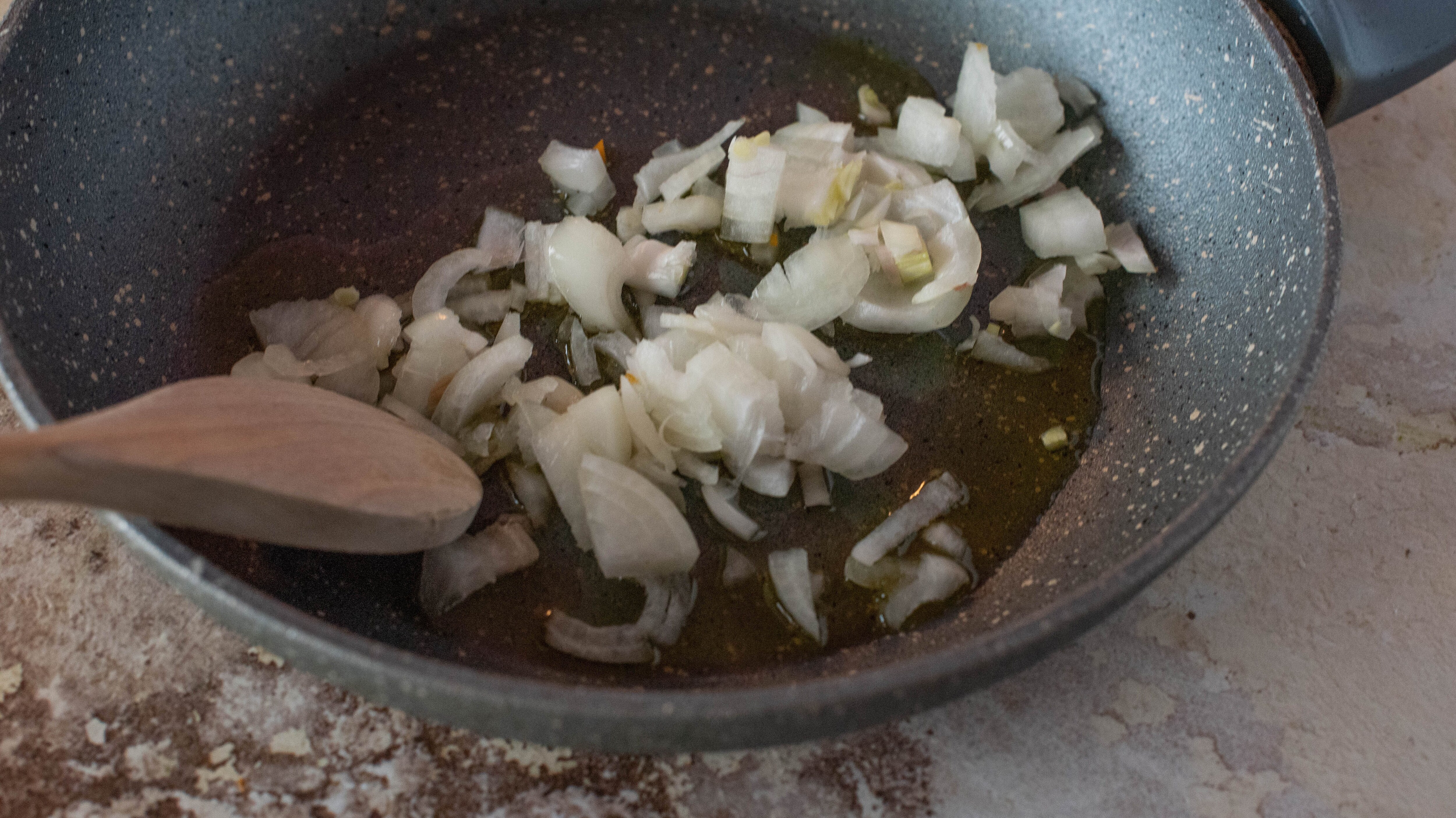 Cut the onion coarsely and put it in a pan to fry with oil.