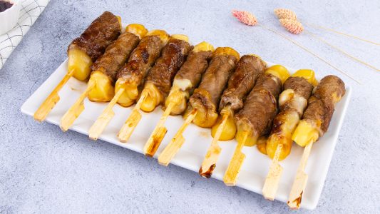 - Keep your skewers pricked into the cheese to hold the shape while rolling the beef.