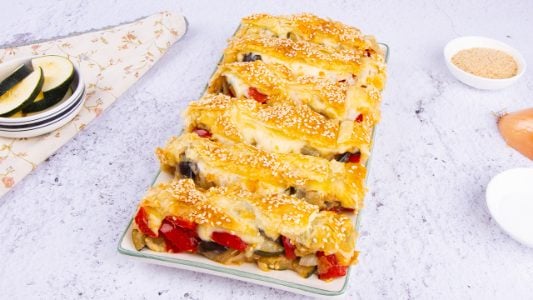 Making the veggie strudel is very easy. You begin by sautéing onions with zucchini, eggplant, and bell peppers. Then, the strudel is assembled with the vegetables and cheese before being brushed with egg wash, sprinkled with sesame seeds, and baked in the oven. This strudel is perfect to make in late summer and early Autumn when bell peppers, zucchini, and eggplant are at their prime.