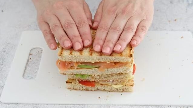 Apply light pressure with your hands to compact the salmon club sandwich.