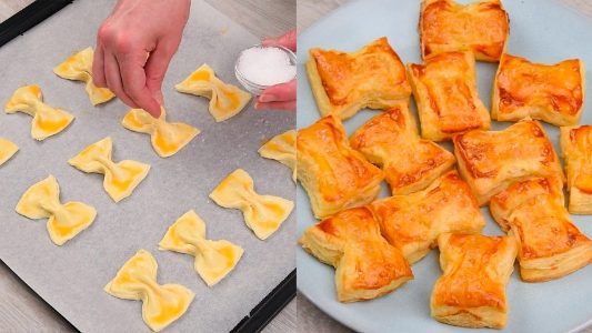 The process of making the savory bows is quick and easy too; all you have to do is cover a sheet of puff pastry with tomato sauce, parmesan, and oregano, before covering it with another sheet of puff pastry. Then, it gets divided into rectangles before being shaped into bows, brushed with egg wash, and baked in the oven. The resulting pastries are reminiscent of pizza, making them delicious for adults and kids alike!
