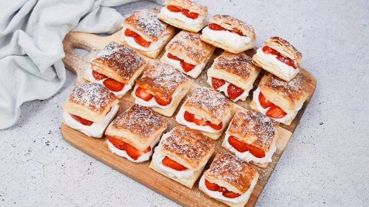 If you love strawberry shortcake, then you will also enjoy this strawberry sporcamuss recipe, which combines crisp, golden puff pastry with a creamy mascarpone filling and fresh strawberries. It is a perfect dessert for when strawberries are in season and you can get them at their best.