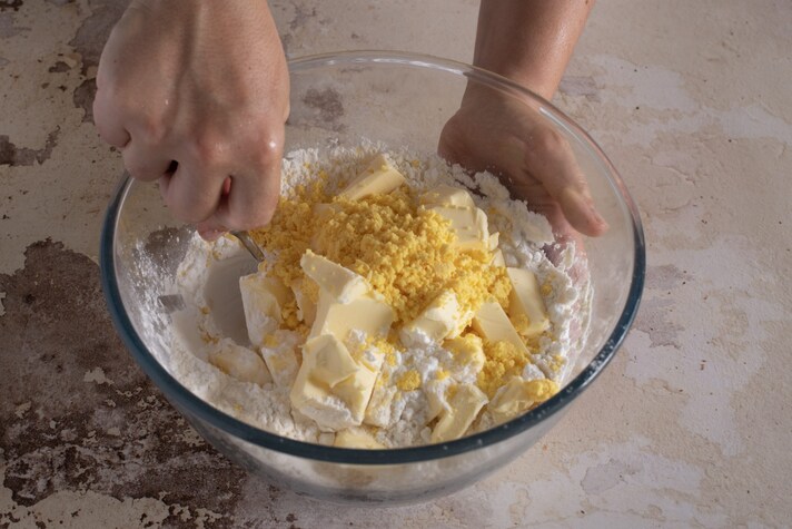 In a bowl, mix the flours with the sugar, salt and vanilla; add the diced butter and the mashed yolks and start kneading (3).