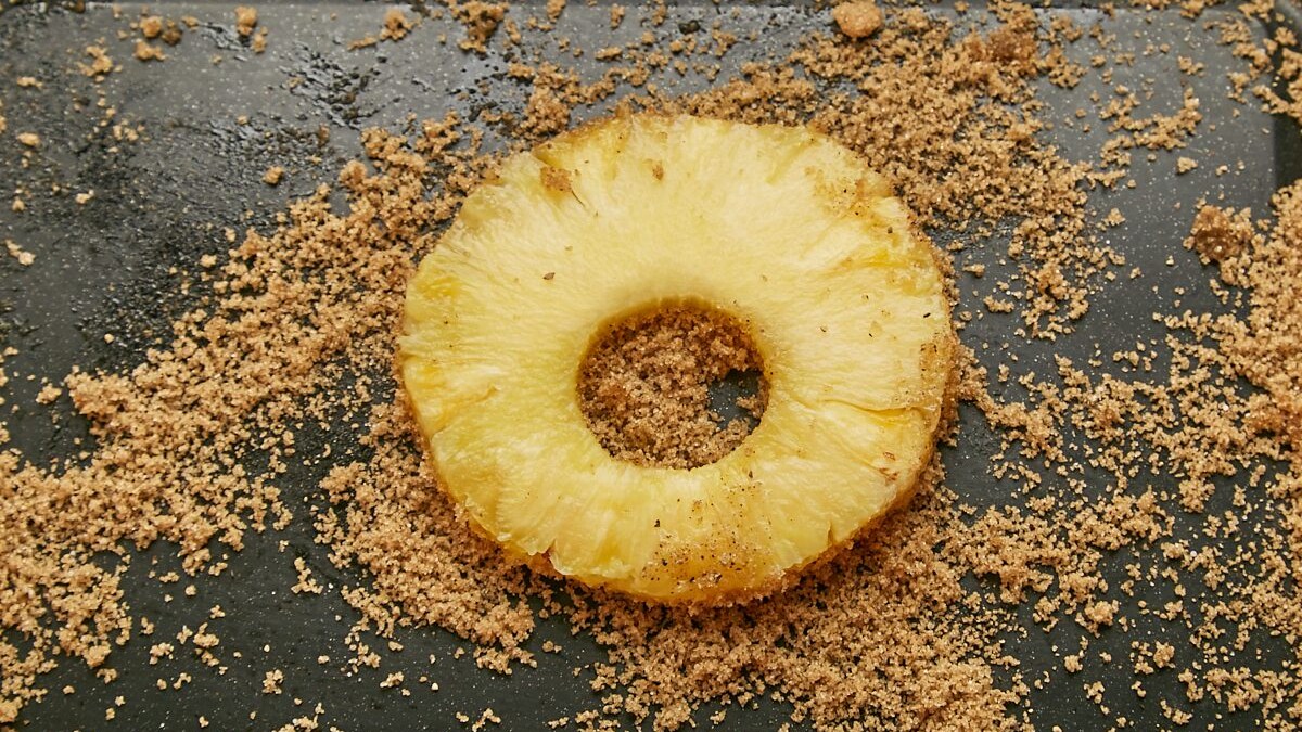 While the oven is heating, pat the pineapple dry with paper towels. Whisk the brown sugar, pepper and salt together in a medium bowl to combine. Put each pineapple ring into the brown sugar mixture, lightly coating both sides.