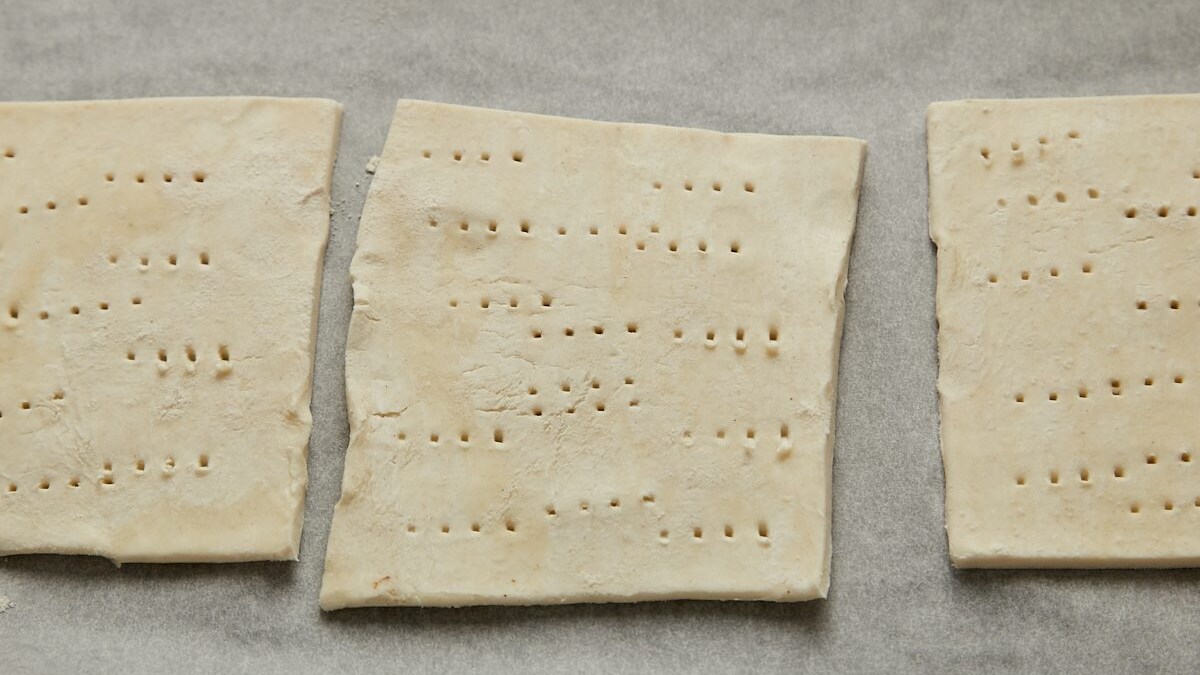 Line two baking sheets with parchment paper and arrange the dough squares evenly on them. Brush each piece of dough evenly with the egg wash, and prick all over with a fork.