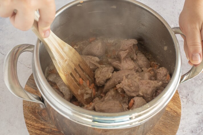 Brown the vegetables with a drizzle of oil in the pressure cooker. Lightly flour the meat and add it to the pan (2).