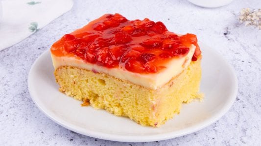 Unlike classic strawberry cakes, this version features a milk-soaked sponge base that stays extra moist, combined with a creamy vanilla pudding layer instead of heavy frosting. The fresh strawberries on top add brightness and balance, while the light strawberry glaze ties everything together beautifully.