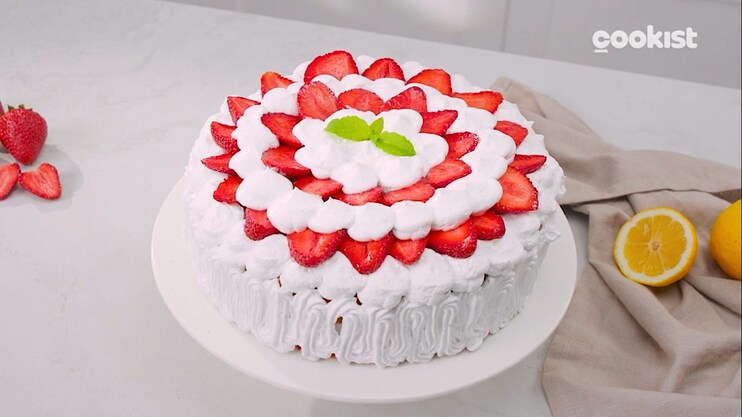 To make this cake, you first make a sponge cake by combining eggs, sugar, flour, and lemon zest, and adding the batter to a round cake pan before baking it in the oven. Then, chopped strawberries get combined with sugar and water, and then, once the strawberries release their juices, the syrup gets reserved so you can brush it on the cake layers. Finally, the cake gets layered with the strawberries and cream before being coated with more whipped cream and topped with additional strawberries. The resulting cake is as beautiful as it is delicious!