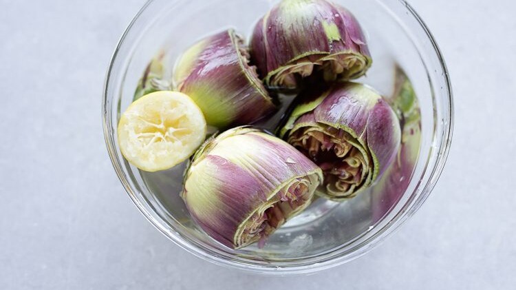 Transfer the peeled artichokes to a bowl with water and the juice of half a lemon for ten minutes.