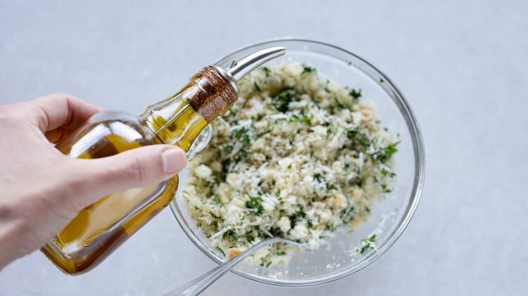 Add the stems of artichokes to the mixture of bread, parsley and cheese and season everything with two tablespoons of extra virgin olive oil and a grind of pepper.