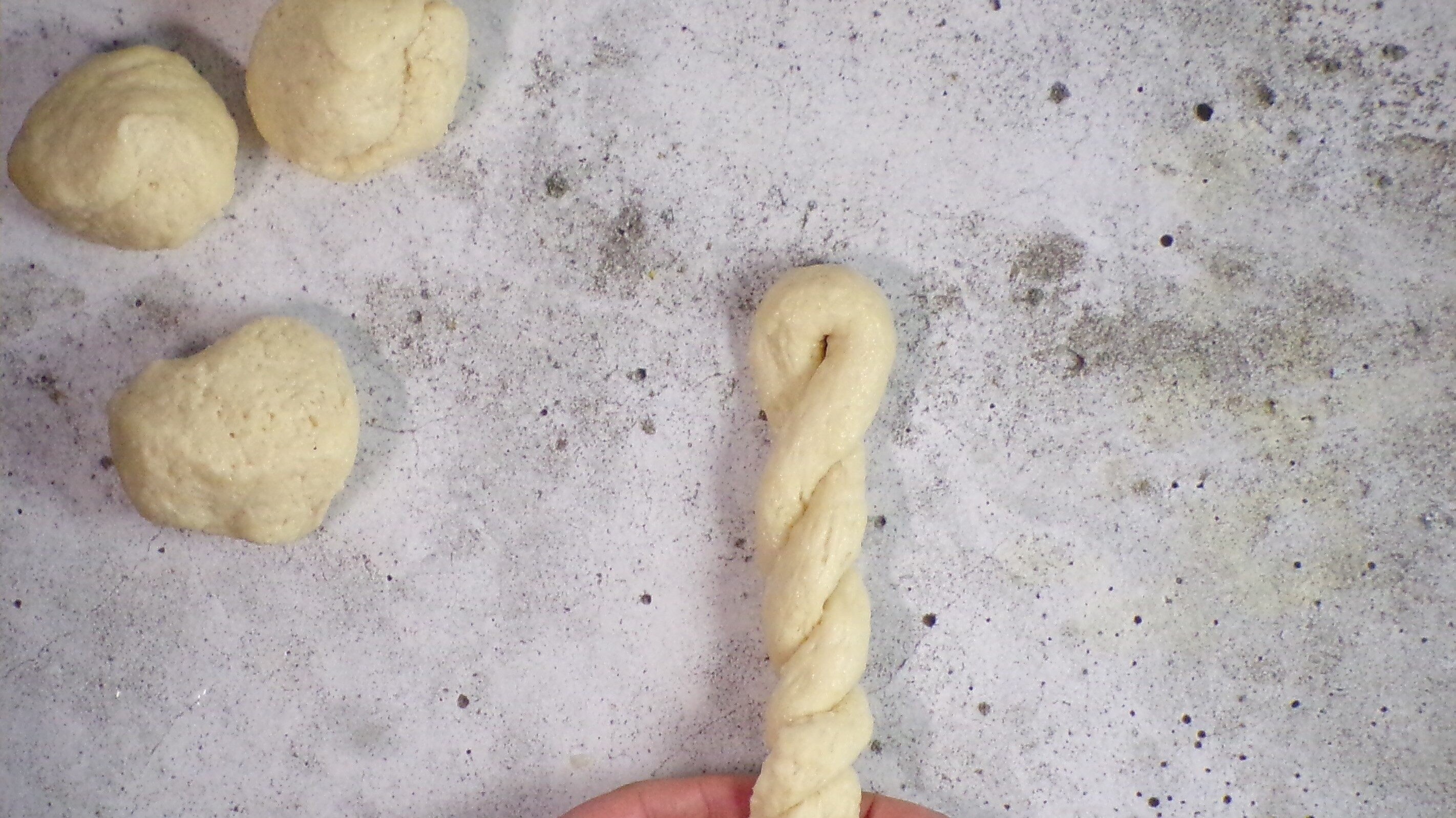With your fingertips roll out each ball and form some small and thin loaves about 40 centimetres long.