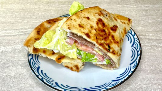 To make the piada burger, you begin by making a burger mixture with ground beef, salt, pepper, and minced shallot. Then, piada bread is covered with the meat mixture before being cooked in a pan until the meat is cooked through. Once it is cooked, it is then garnished with lettuce, tomato slices, and yogurt sauce before being folded and served. The garnishes add freshness that cuts through the richness in the beef.