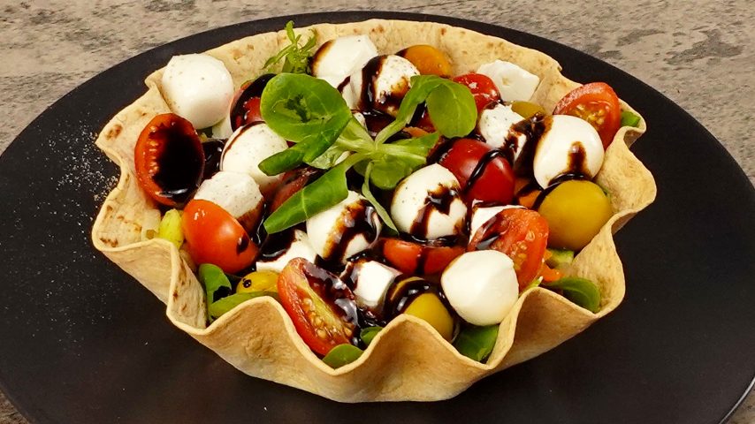 This tortilla basket recipe is a perfect way to serve a salad for a healthy lunch. The tortilla is baked in a fluted pan so that it becomes crispy and forms a bowl that can be filled with greens, cherry tomatoes, cheese, and dressing.