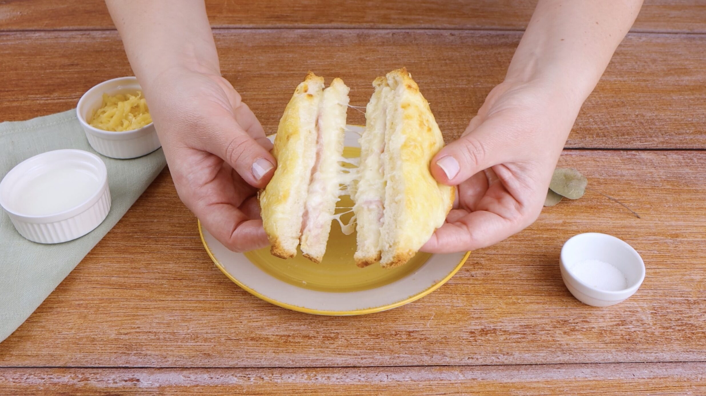 Place 2 slices of bread on a cutting board. Spread a spoonful of béchamel sauce on each slice. Add shredded cheese and a slice of ham, then top with another slice of bread.